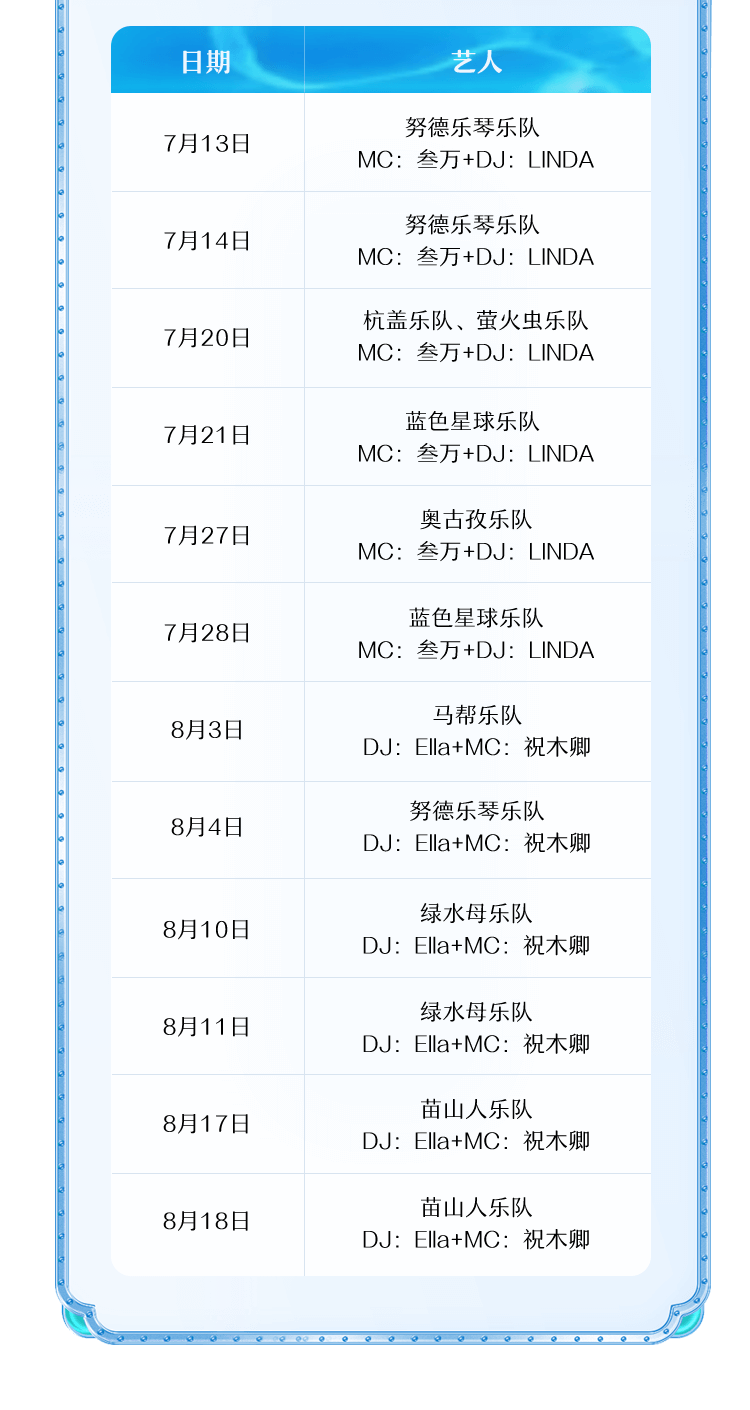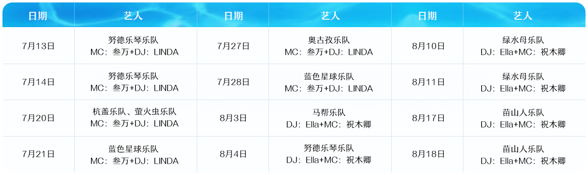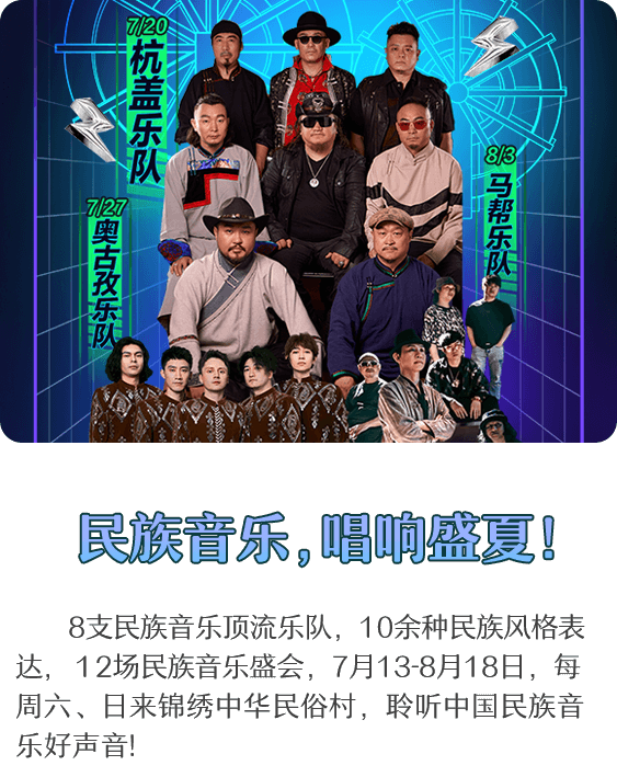 8支民族音乐顶流乐队,10余种民族风格表达,12场民族音乐盛会,7月13-8月18日,每周六、日来锦绣中华民俗村,聆听中国民族音乐好声音!