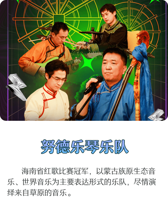 海南省红歌比赛冠军,以蒙古族原生态音乐、世界音乐为主要表达形式的乐队,尽情演绎来自草原的音乐。