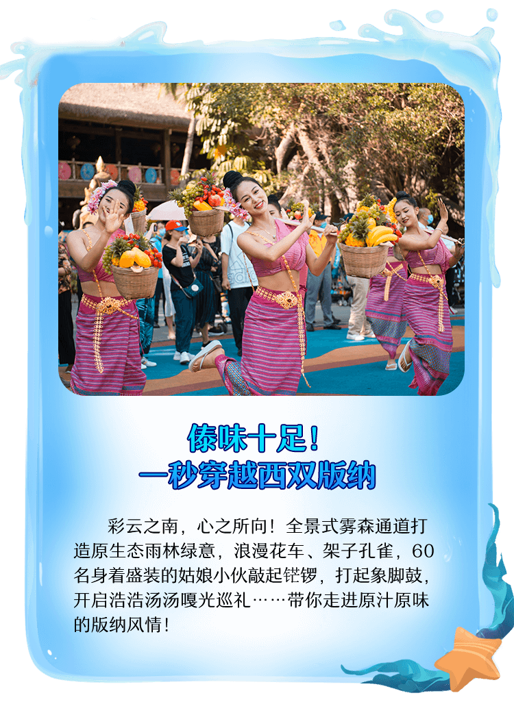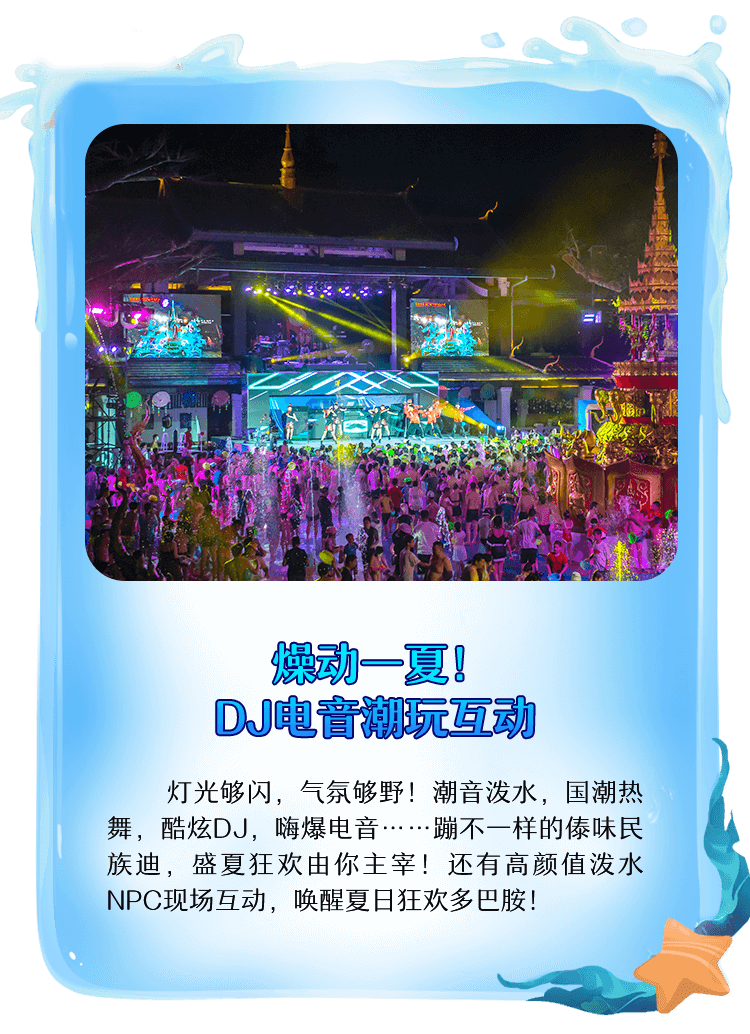 灯光够闪,气氛够野!潮音泼水,国潮热舞,酷炫DJ,嗨爆电音……蹦不一样的傣味民族迪,盛夏狂欢由你主宰!还有高颜值泼水NPC现场互动,唤醒夏日狂欢多巴胺!