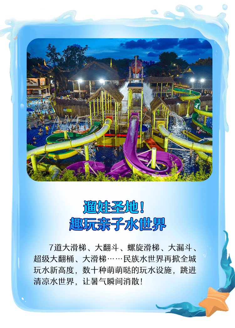 7道大滑梯、大翻斗、螺旋滑梯、大漏斗、超级大翻桶、大滑梯……民族水世界再掀全城玩水新高度,数十种萌萌哒的玩水设施,跳进清凉水世界,让暑气瞬间消散!