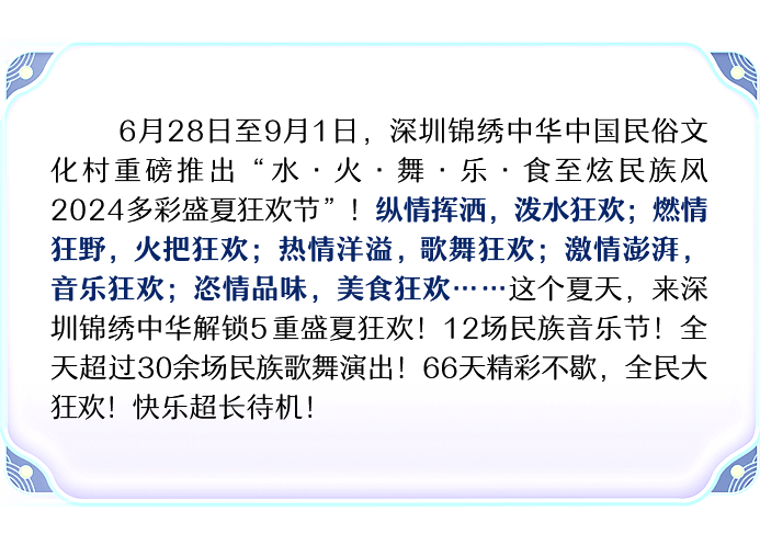 6月28日至9月1日,深圳锦绣中华中国民俗文化村重磅推出“水·火·舞·乐·食 至炫民族风 2024多彩盛夏狂欢节”!纵情挥洒,泼水狂欢;燃情狂野,火把狂欢;热情洋溢,歌舞狂欢;激情澎湃,音乐狂欢;恣情品味,美食狂欢……这个夏天,来深圳锦绣中华解锁5重盛夏狂欢!12场民族音乐节!全天超过30余场民族歌舞演出!66天精彩不歇,全民大狂欢!快乐超长待机!