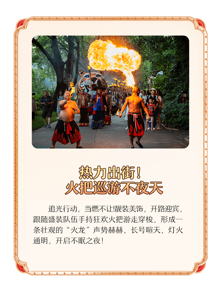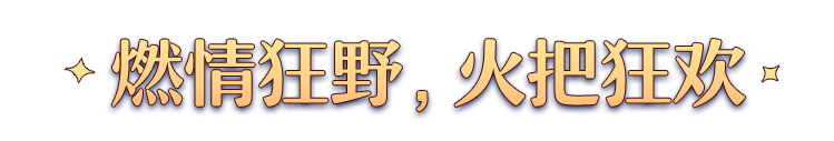 追光行动,当燃不让!靓装美饰,开路迎宾,跟随盛装队伍手持狂欢火把游走穿梭,形成一条壮观的“火龙”声势赫赫,长号喧天,灯火通明,开启不眠之夜!