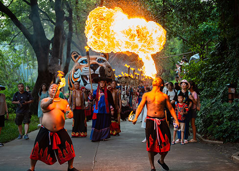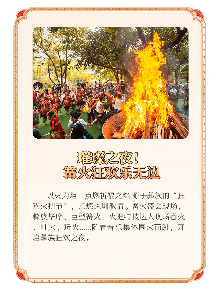 以火为炬,点燃祈福之焰!源于彝族的“狂欢火把节”,点燃深圳激情。篝火盛会现场,彝族毕摩、巨型篝火,火把特技达人现场吞火、吐火、玩火......随着音乐集体围火而跳,开启彝族狂欢之夜。