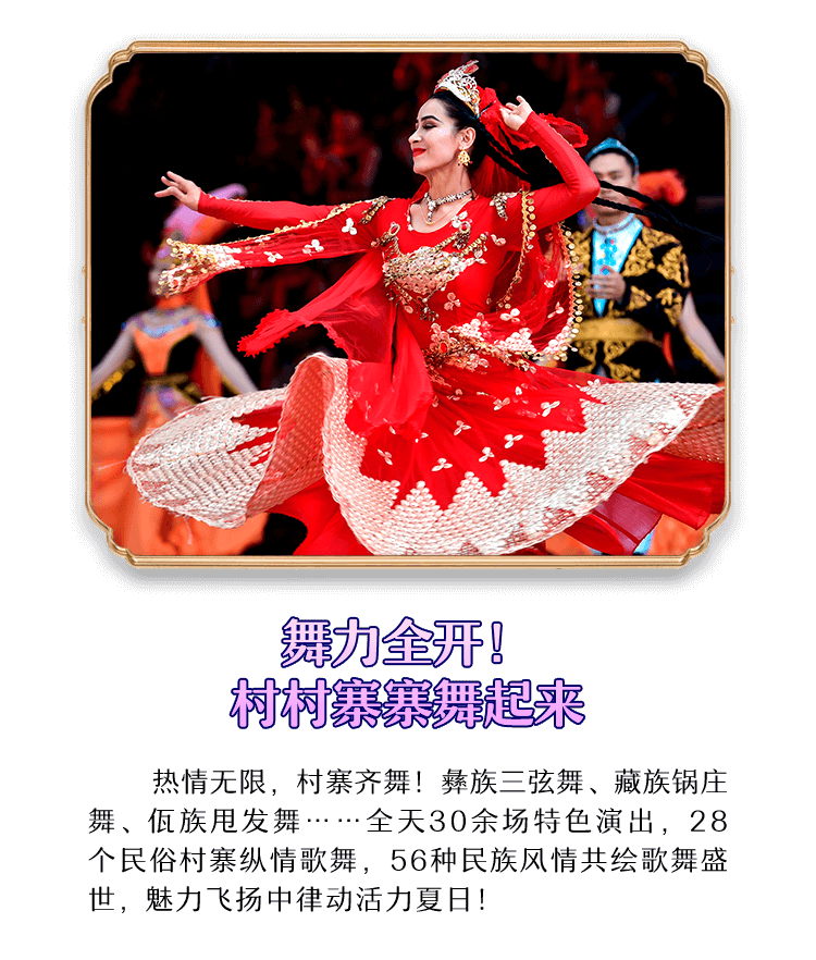 热情无限,村寨齐舞!彝族三弦舞、藏族锅庄舞、佤族甩发舞……全天30余场特色演出,28个民俗村寨纵情歌舞,56种民族风情共绘歌舞盛世,魅力飞扬中律动活力夏日!
