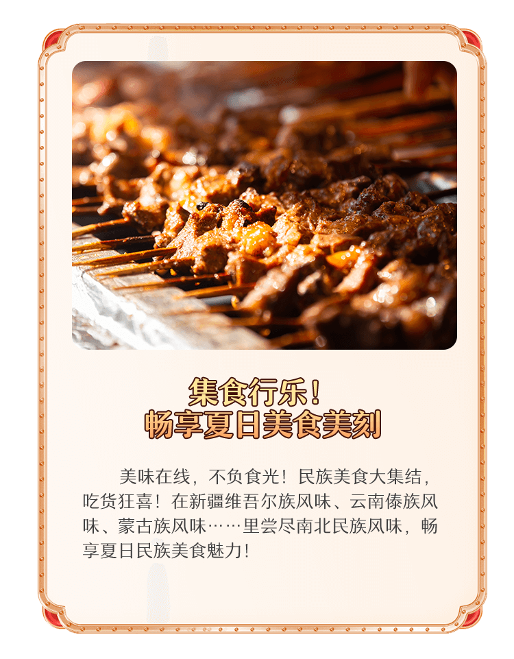 美味在线,不负食光!民族美食大集结,吃货狂喜!在新疆维吾尔族风味、云南傣族风味、蒙古族风味……里尝尽南北民族风味,畅享夏日民族美食魅力!