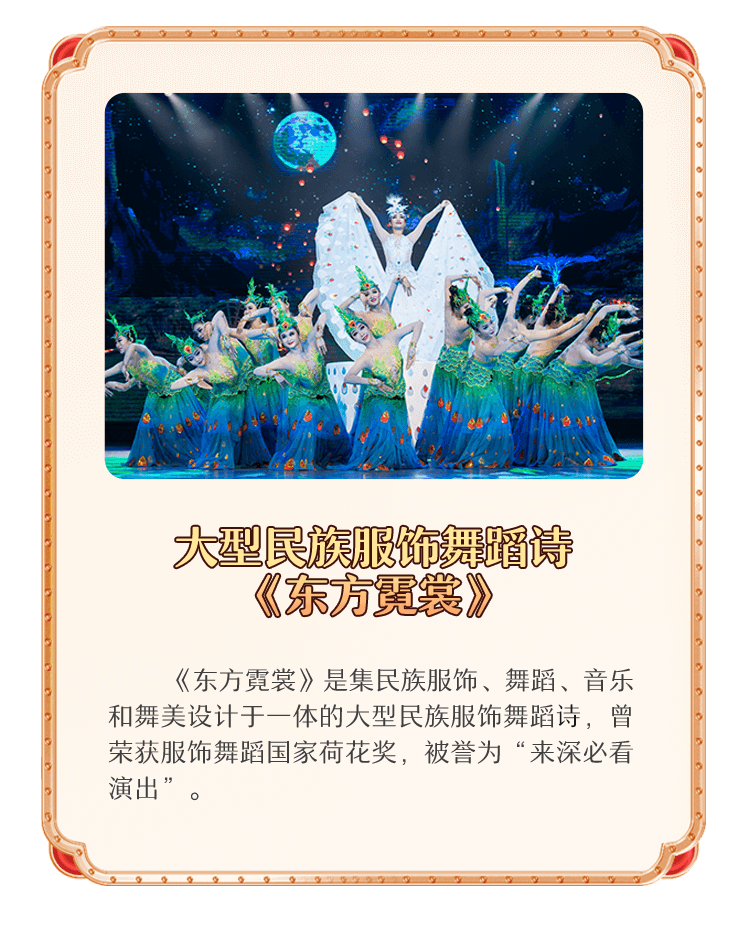 《东方霓裳》是集民族服饰、舞蹈、音乐和舞美设计于一体的大型民族服饰舞蹈诗,曾荣获服饰舞蹈国家荷花奖,被誉为“来深必看演出”。