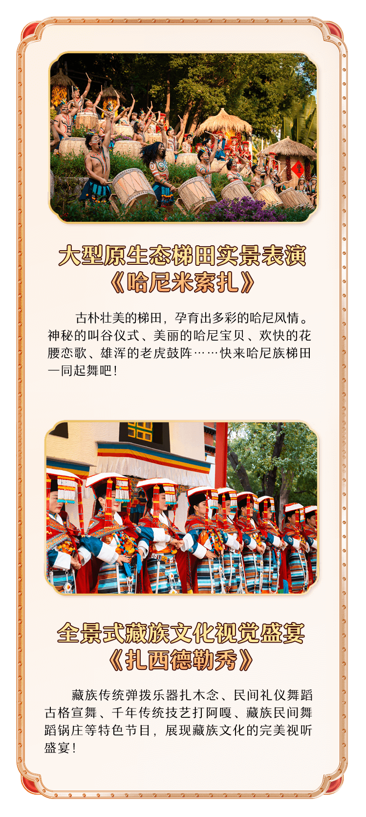 藏族传统弹拨乐器扎木念、民间礼仪舞蹈古格宣舞、千年传统技艺打阿嘎、藏族民间舞蹈锅庄等特色节目,展现藏族文化的完美视听盛宴!