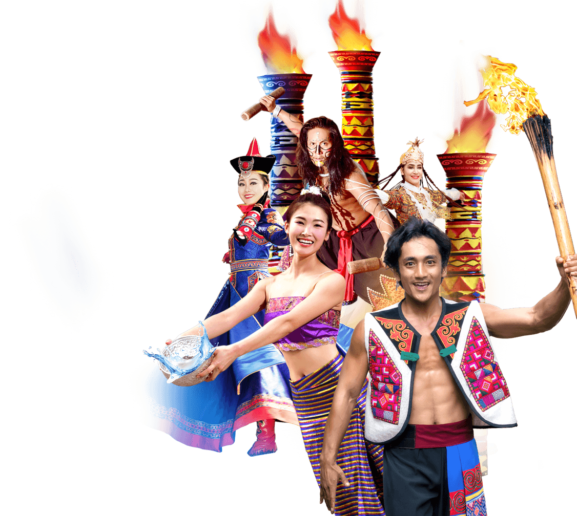 28个民族,56种风情,少数民族兄弟姐妹载歌载舞,这里有佤族甩发舞、藏族长袖舞、傣族孔雀舞……民俗风情异彩纷呈,展开一幅幅民族风情画。