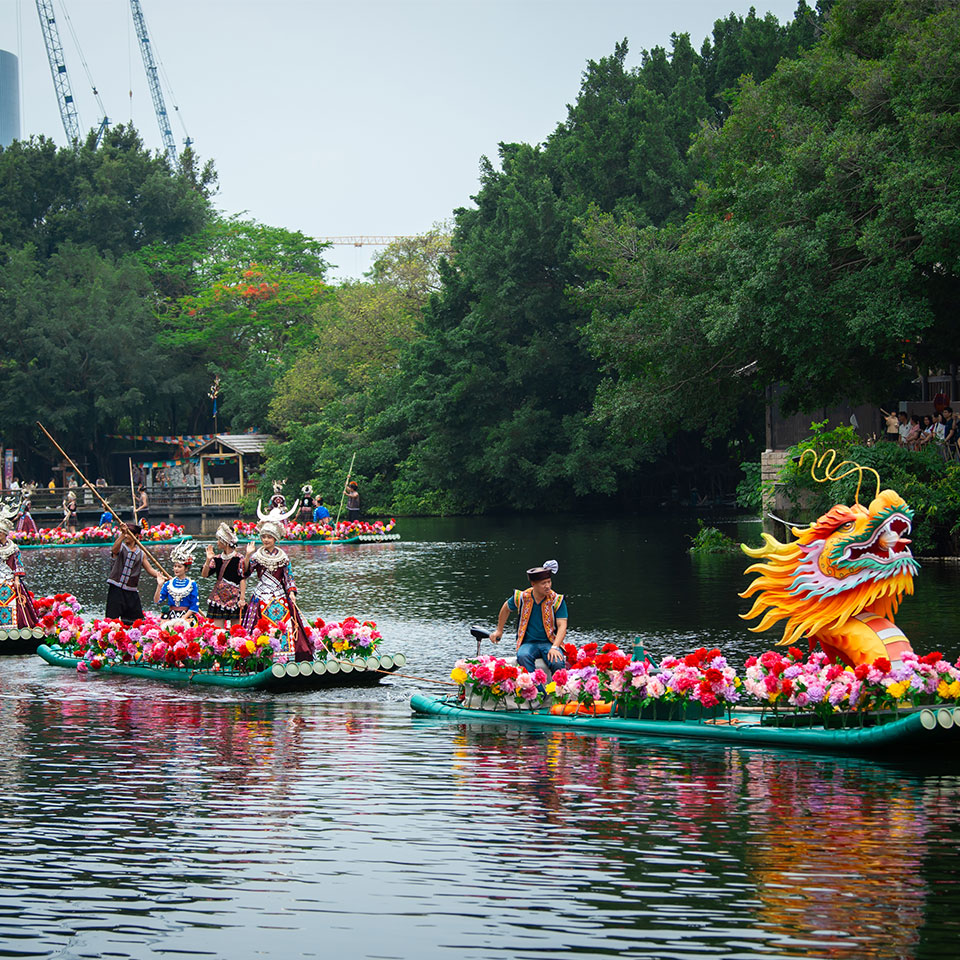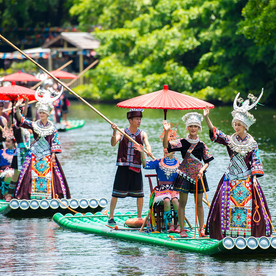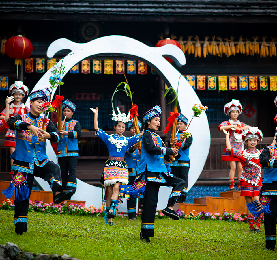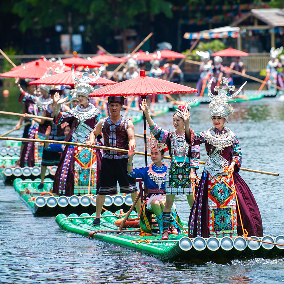 以苗族龙文化为背景,依托景区翠湖的自然风光和风雨桥的独特建筑,以宽阔的湖面为舞台,湖水为景,天地为幕,通过苗族神圣的祭龙、祭水、请龙仪式,独特的非遗舞蹈,行进式的游船表演。集中展示苗族服饰的绚丽多彩、舞蹈的婀娜多姿、乐器的原始古朴、节日的神奇传说,舟行碧波上,人在画中游,一起体验一场独一无二的民族盛会!